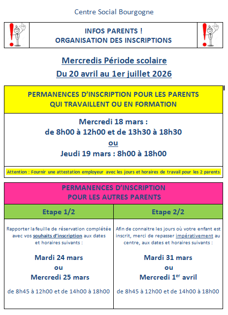 Retrouvez ci dessous les infos concernant les dates d’inscription pour les mercredis en période scolaire du 20 avril au 1er juillet 2026